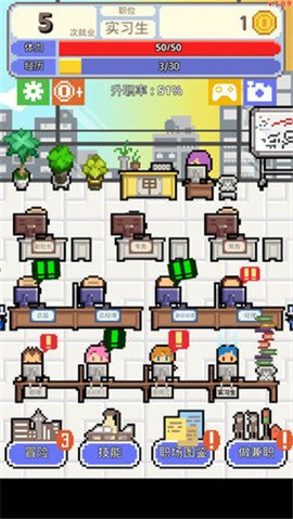 求职生存战无限金币和满升职是一款玩法简单的休闲游戏。采用了像素的风格打造的,画面复古可爱,体积极小且操作简单。玩家在游戏中需要扮演一个实习生,通过不断的求职来体验不一样的人生。游戏的剧情内容也很精彩,感兴趣的玩家不要错过,欢迎来本站下载试试。