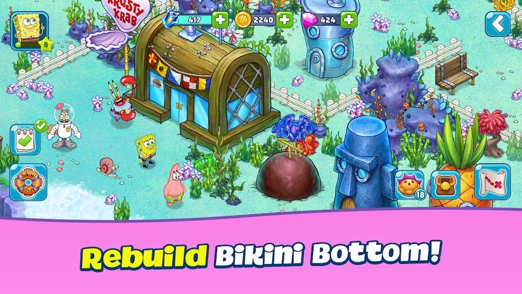 玩家主要帮助海绵宝宝在海底进行各种探索,在探索的过程中,玩家也尽可能的收集不同的道具。