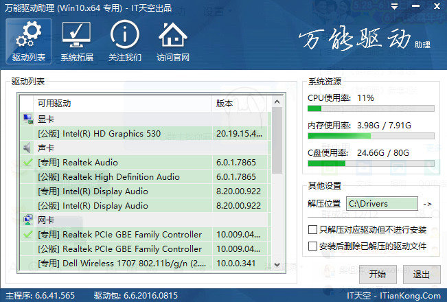 2、智能精确识别硬件设备,搭载了IT天空开发团队精心整理制作的驱动包;支持市面上绝大多数主流硬件;
