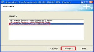 7.自动回到驱动窗口选择打印机型号“hp m1136”。单击“下一步”。